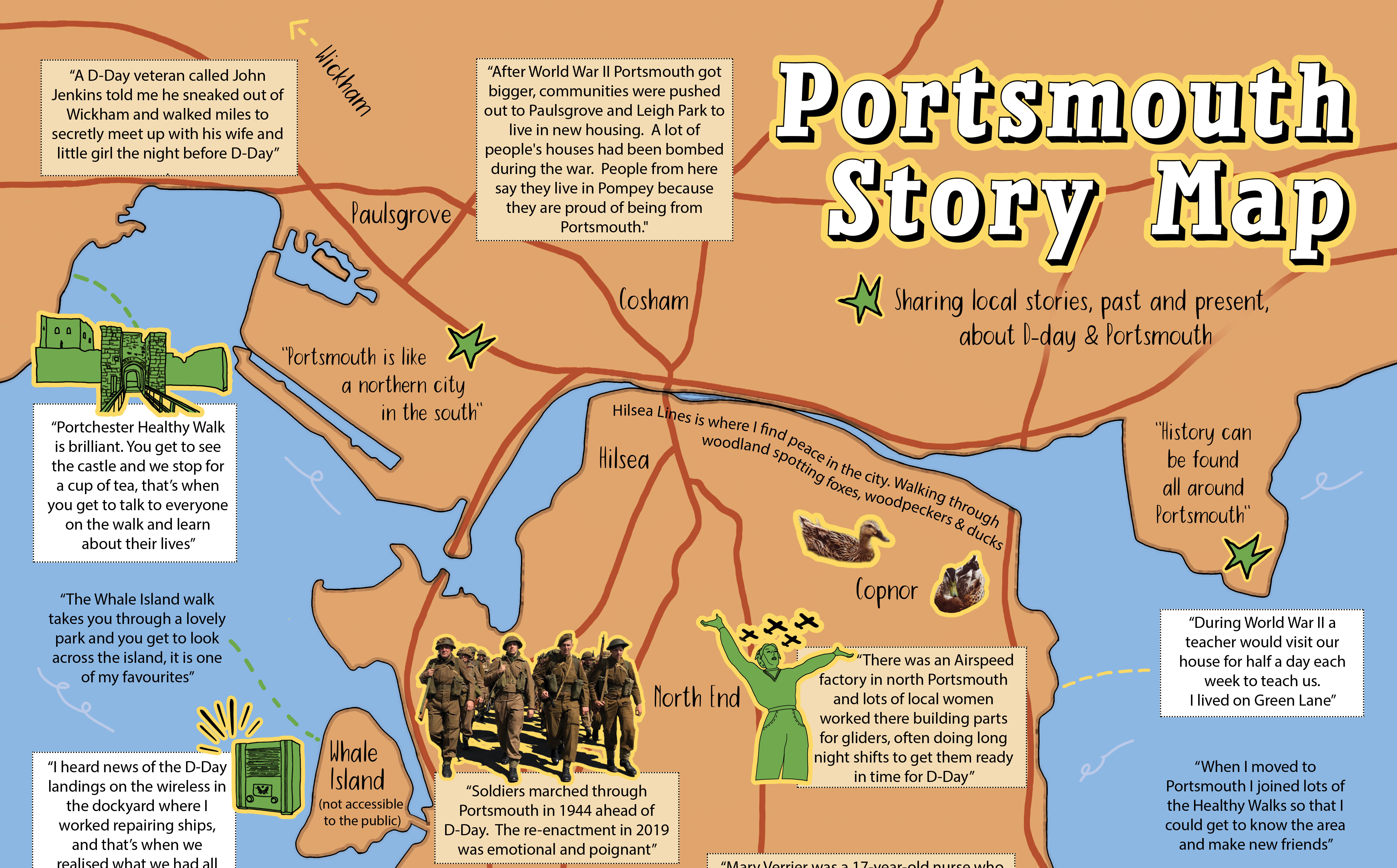 The story map features designs, doodles and photographs created by people in Portsmouth through a social media campaign. As well as stories gathered by talking to key members of the community, veterans and volunteers over the phone and video calls.
