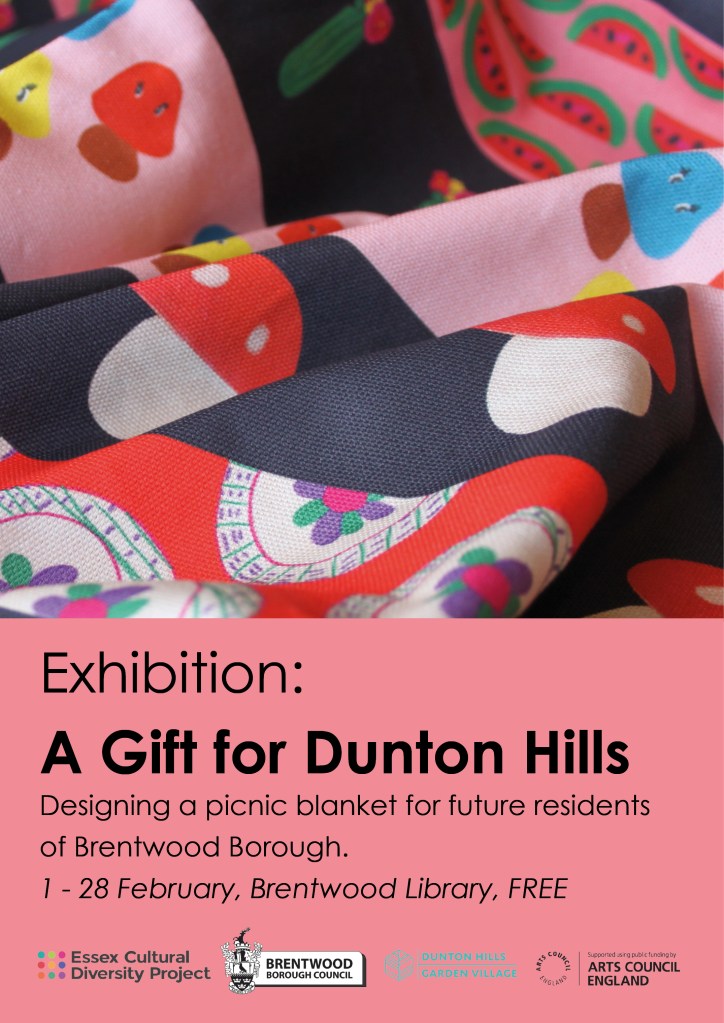 The project was commissioned by Essex Cultural Diversity Project and Brentwood Borough Council, supported by Arts Council England. Dunton Hills Garden Village is a new settlement proposed in Brentwood Borough, the picnic blanket design will be shared with the housing developers as a suggested welcome gift for future residents of Dunton Hills.