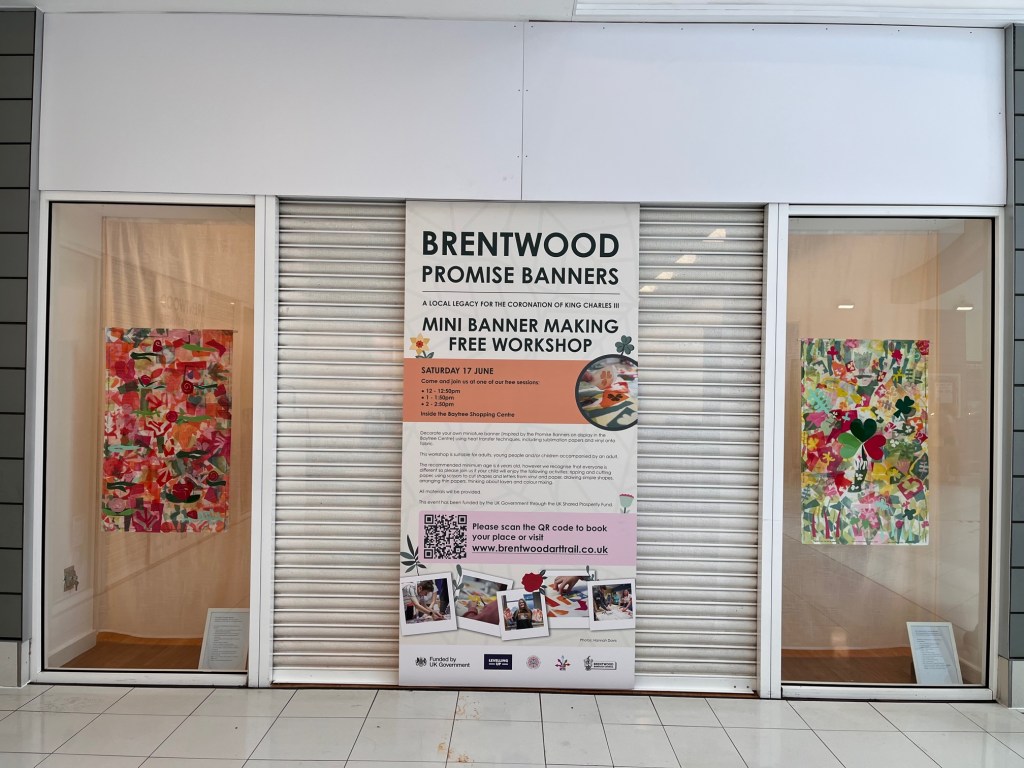 Becky facilitated workshops for 150 people including families at a festival, a SEN youth group, a YMCA, and for shopping centre visitors and local creative adults. Their Promise Banners were exhibited, in an empty unit at The Baytree Shopping Centre, as part of the Brentwood Art Trail in June 2023.