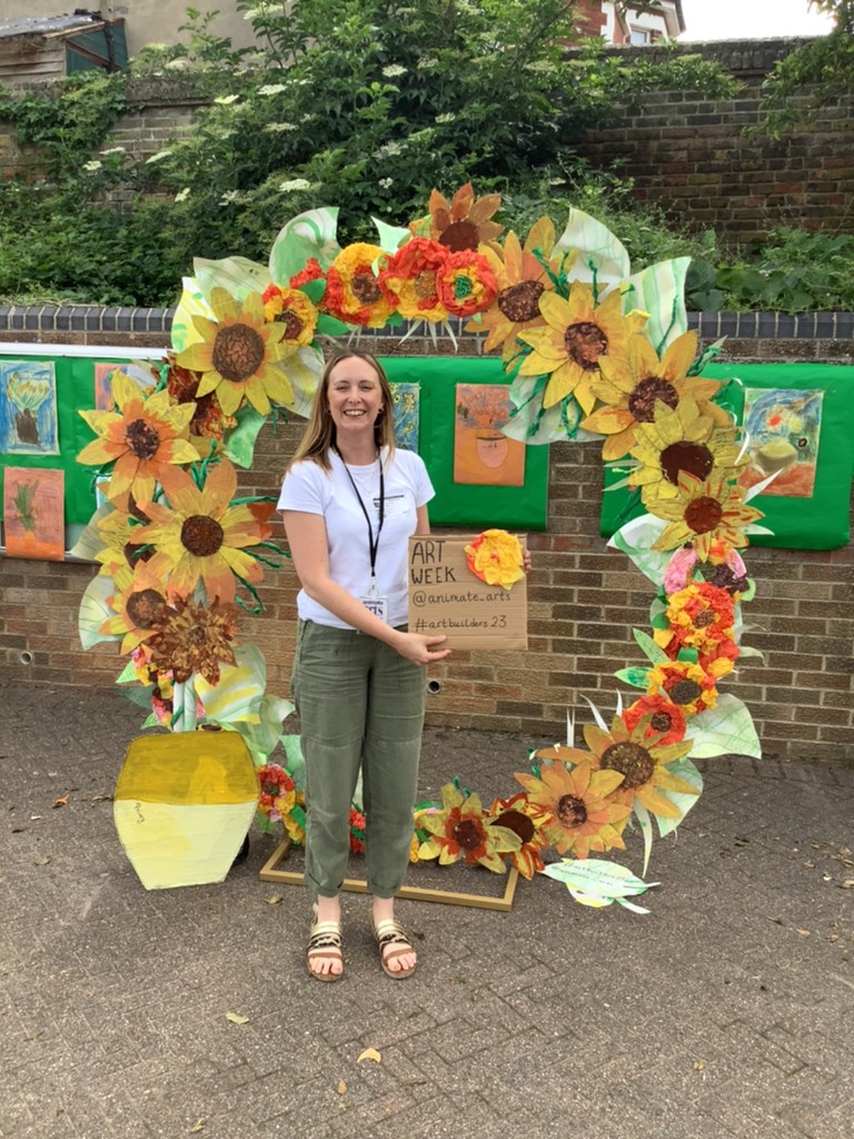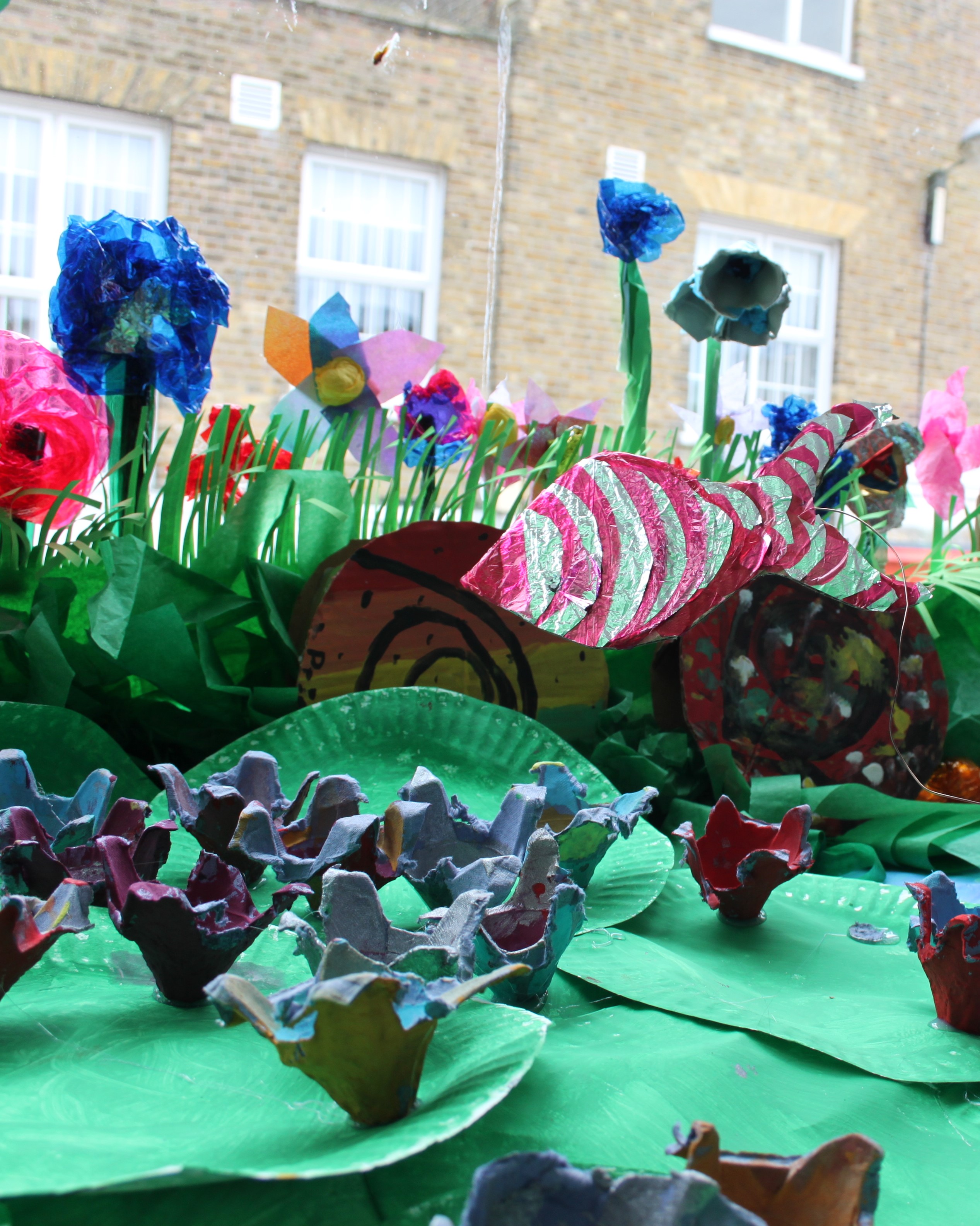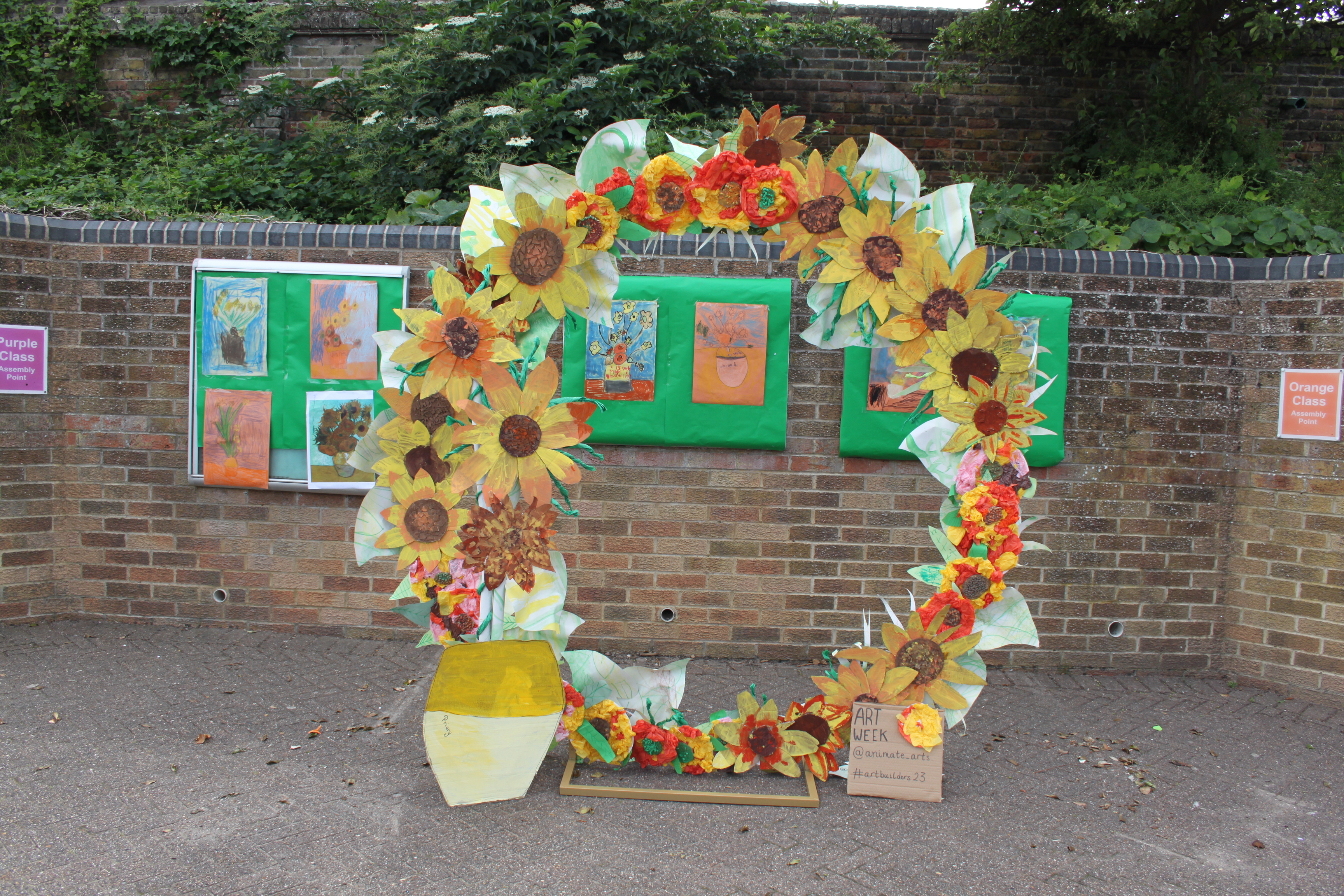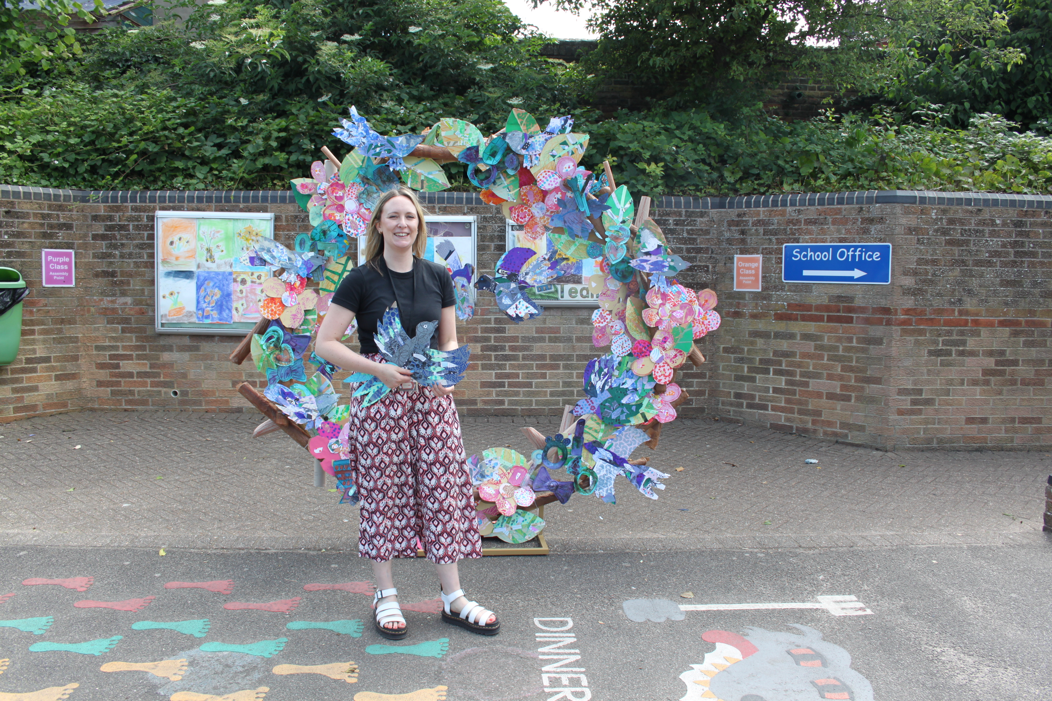 Becky has had the wonderful opportunity to collaborate with the wonderfully creative Priory Infants School in Ramsgate twice, together they have crafted a 2m circular display using only paper and cardboard. During the first year, they brought to life stunning sunflowers inspired by Van Gogh, and in the second year, they magically transformed cereal boxes into a vibrant, colorful nest from the book “Magpies Treasure”