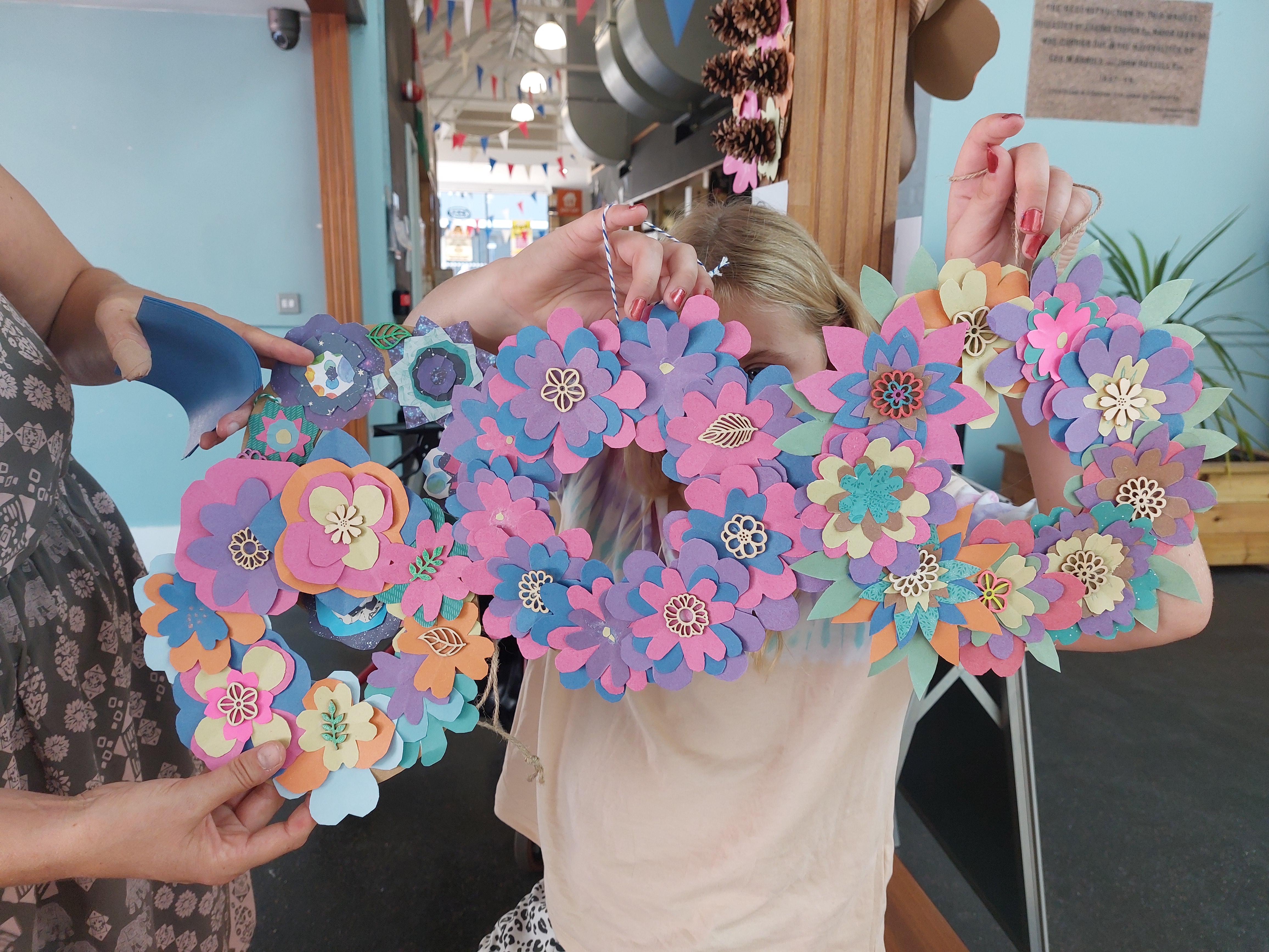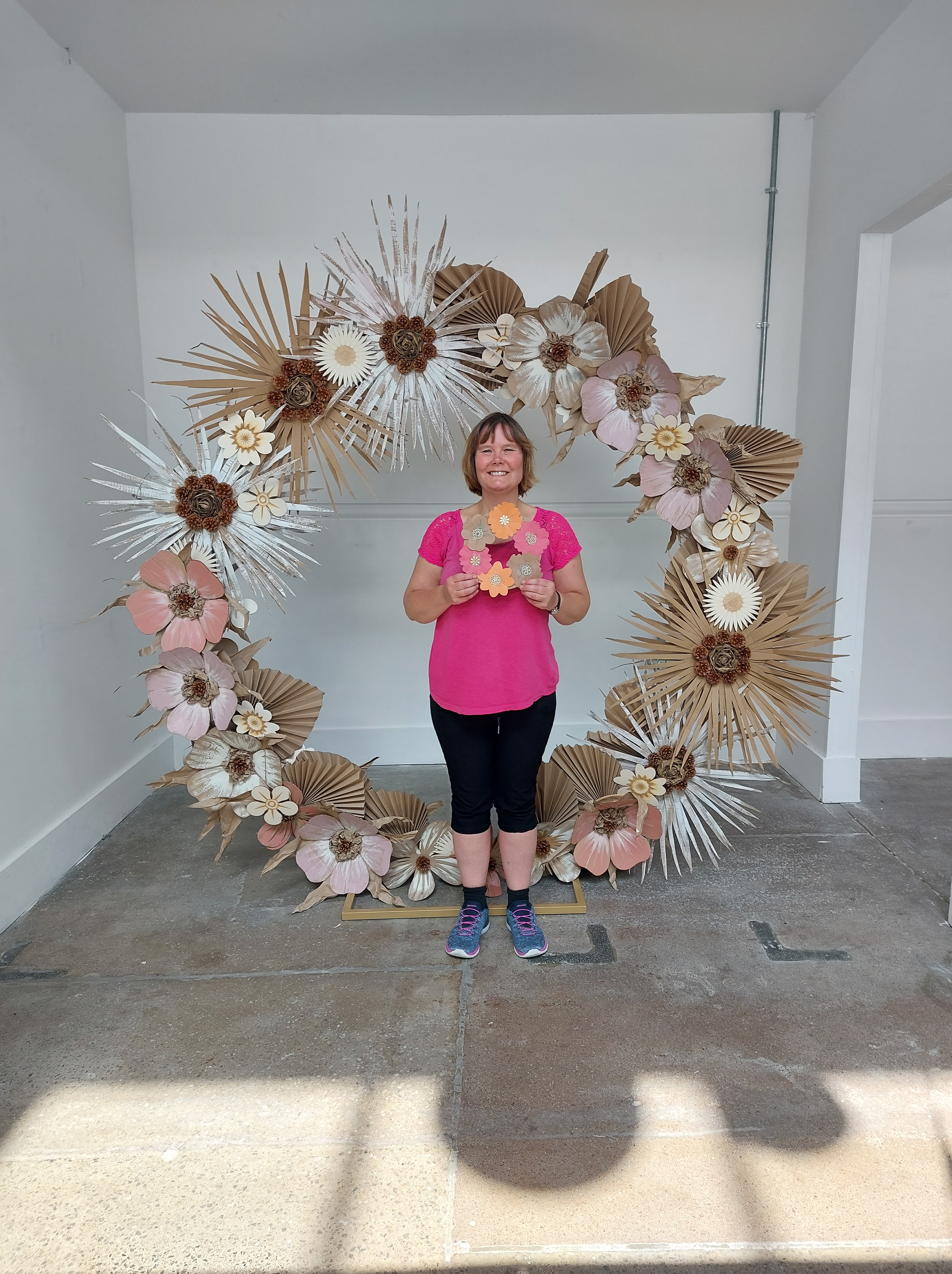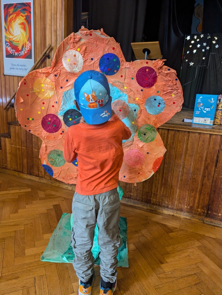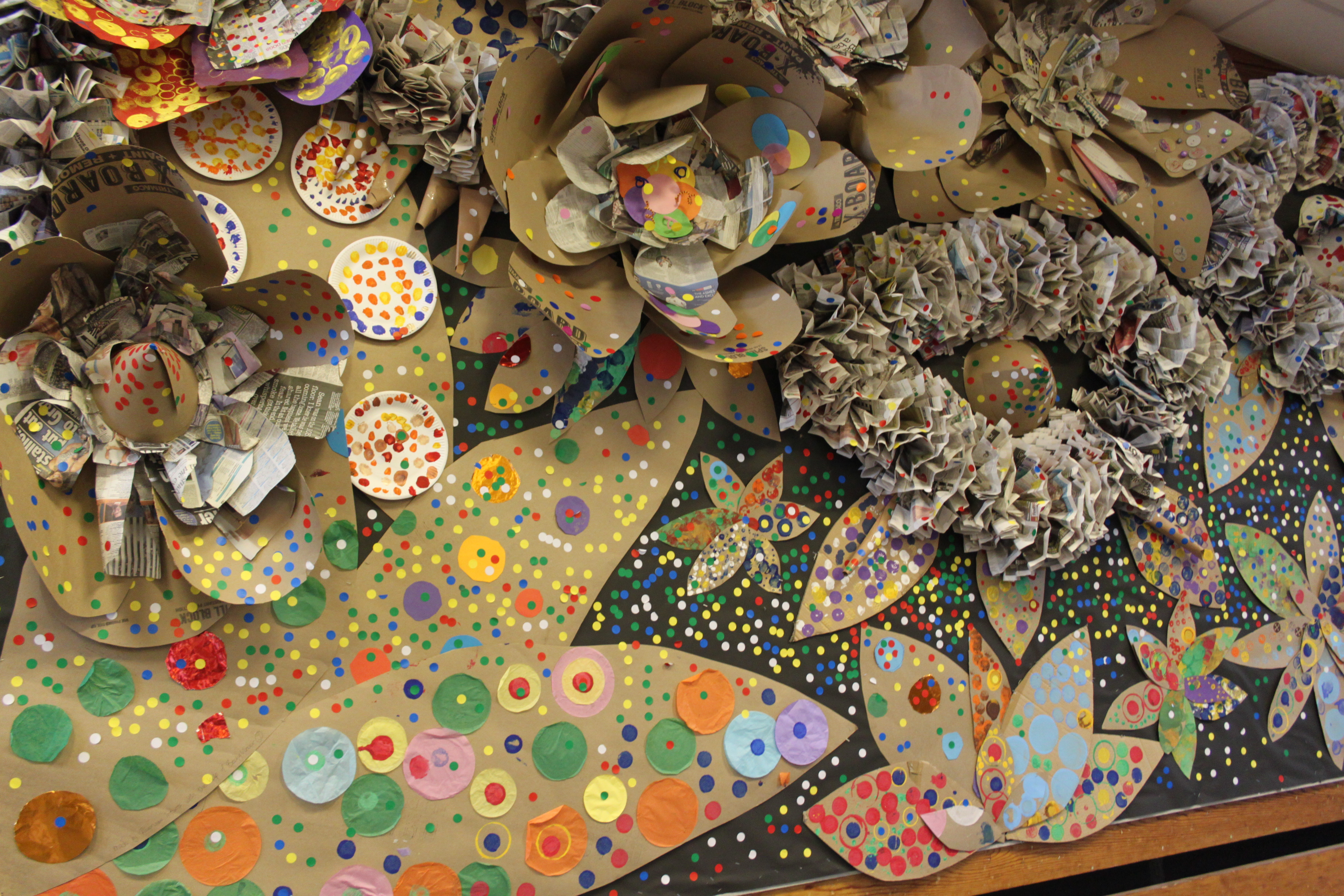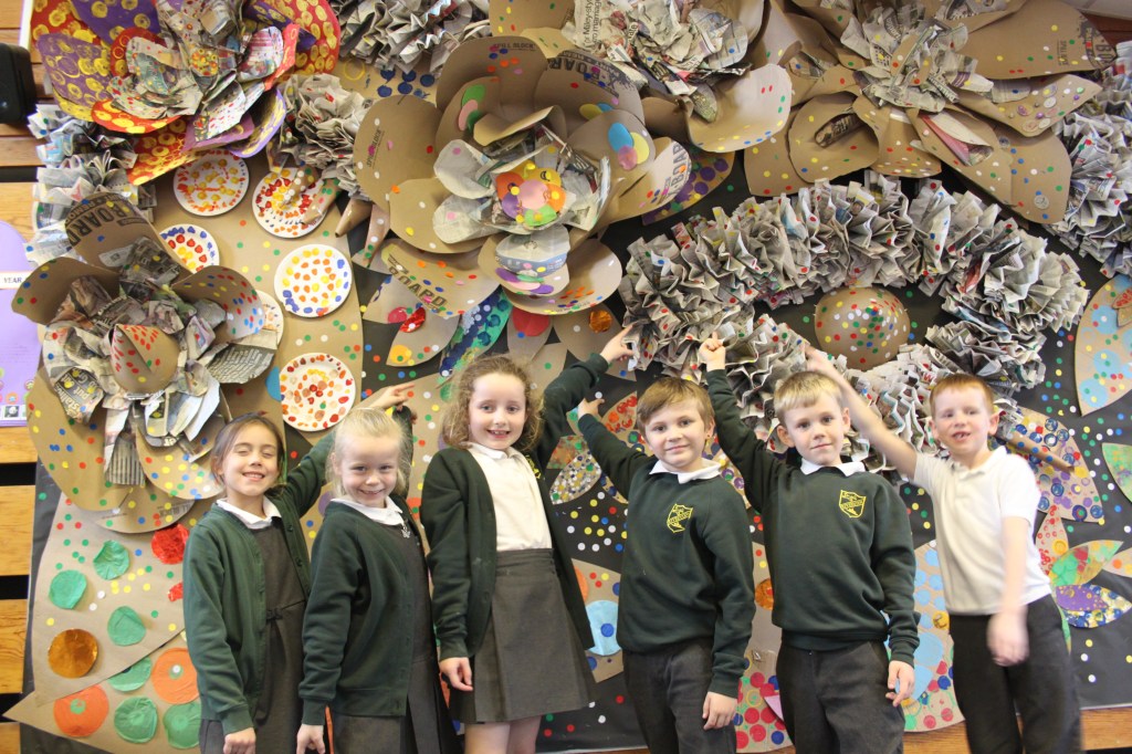 Becky has had the wonderful opportunity to collaborate with the wonderfully creative Priory Infants School in Ramsgate twice, together they have crafted a 2m circular display using only paper and cardboard. During the first year, they brought to life stunning sunflowers inspired by Van Gogh, and in the second year, they magically transformed cereal boxes into a vibrant, colorful nest from the book “Magpies Treasure”