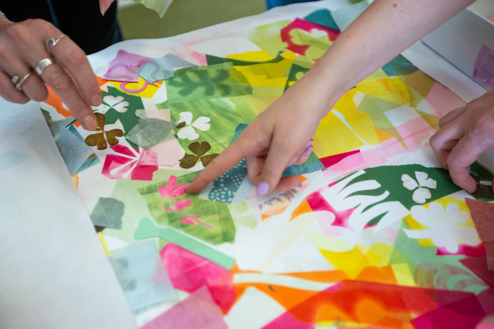 The children used collage, painting, and sublimation dye printing techniques to create detailed artworks on recycled ripstop fabric. Their artworks were displayed as large banners throughout July and August 2024 and a special celebration event was held for families.